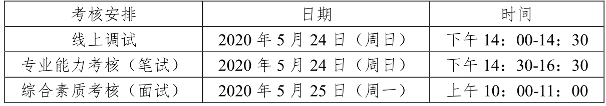 定于2020年5月24日-5月25日,对通过材料初审且经过公示的申请人(名单请见//yjszs.18-comics.net/info/1011/1833.htm)分别进行专业能力和综合素质考核,具体安排如下: