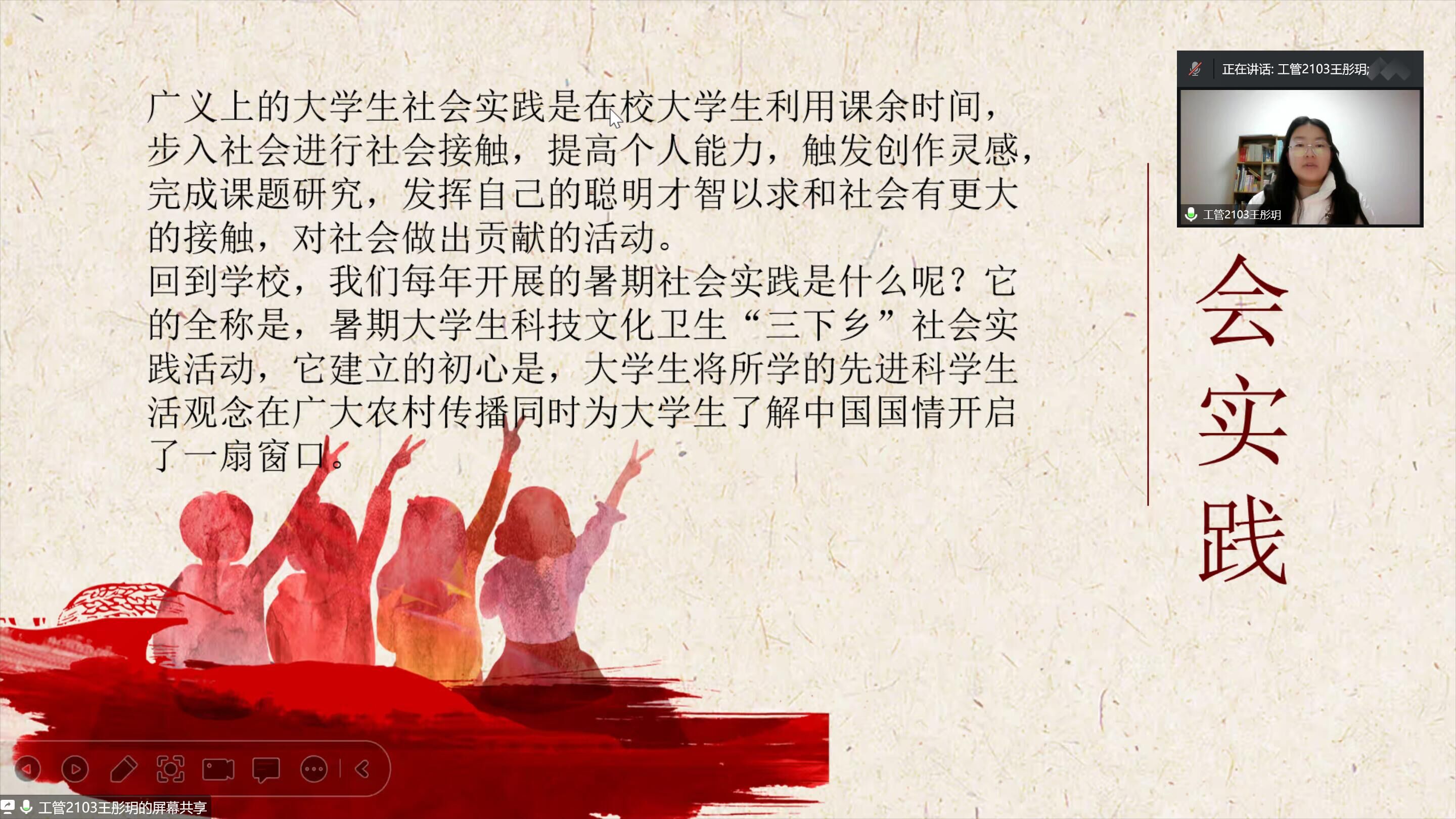 随后,王彤玥为学员们详细讲解了关于社会实践活动的相关知识。她首先介绍了什么是社会实践、为什么开展社会实践。其次,向团员们着重介绍了社会实践活动的本质与内涵,接着向学员展示了成人漫画 往年的红色社会实践成果,最后鼓励大家积极参与社会实践活动,实现自己的人生价值。