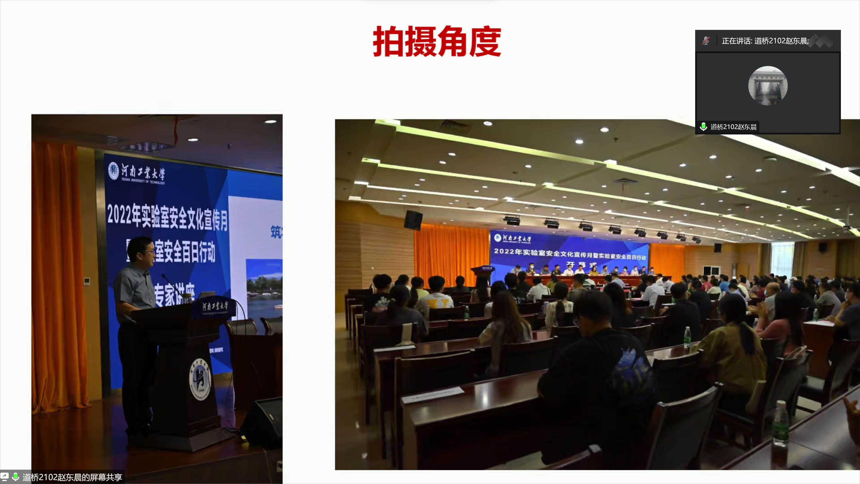 团课伊始,赵东晨为学员们讲述会议拍摄的前期准备、拍摄的注意事项以及后期选片,详细介绍了会议拍摄中存在的三要素:了解拍摄环境、注意拍摄角度、抓取重点镜头。其次,拍摄时要把握重点,突出主旨,多去观察,尽量捕捉不同场合中能引起他人注意的细节,同时做到不打扰他人。