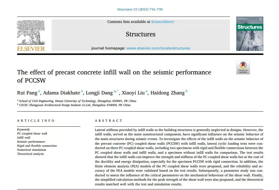 2019级海外留学硕士研究生AdamaDiakhat在国际高水平学术期刊Structures(JCR Q2,IF=4.010)上发表了题为“The effect of precast concrete infill wall on the seismic performance of PCCSW”(DOI:10.1016/j.istruc.2023.04. 076)的研究论文,该项成果为学院装配式建筑与智能建造科研团队围绕考虑预制混凝土(PC)填充墙的装配式联肢剪力墙结构开展一系列抗震性能研究的阶段成果,成人漫画