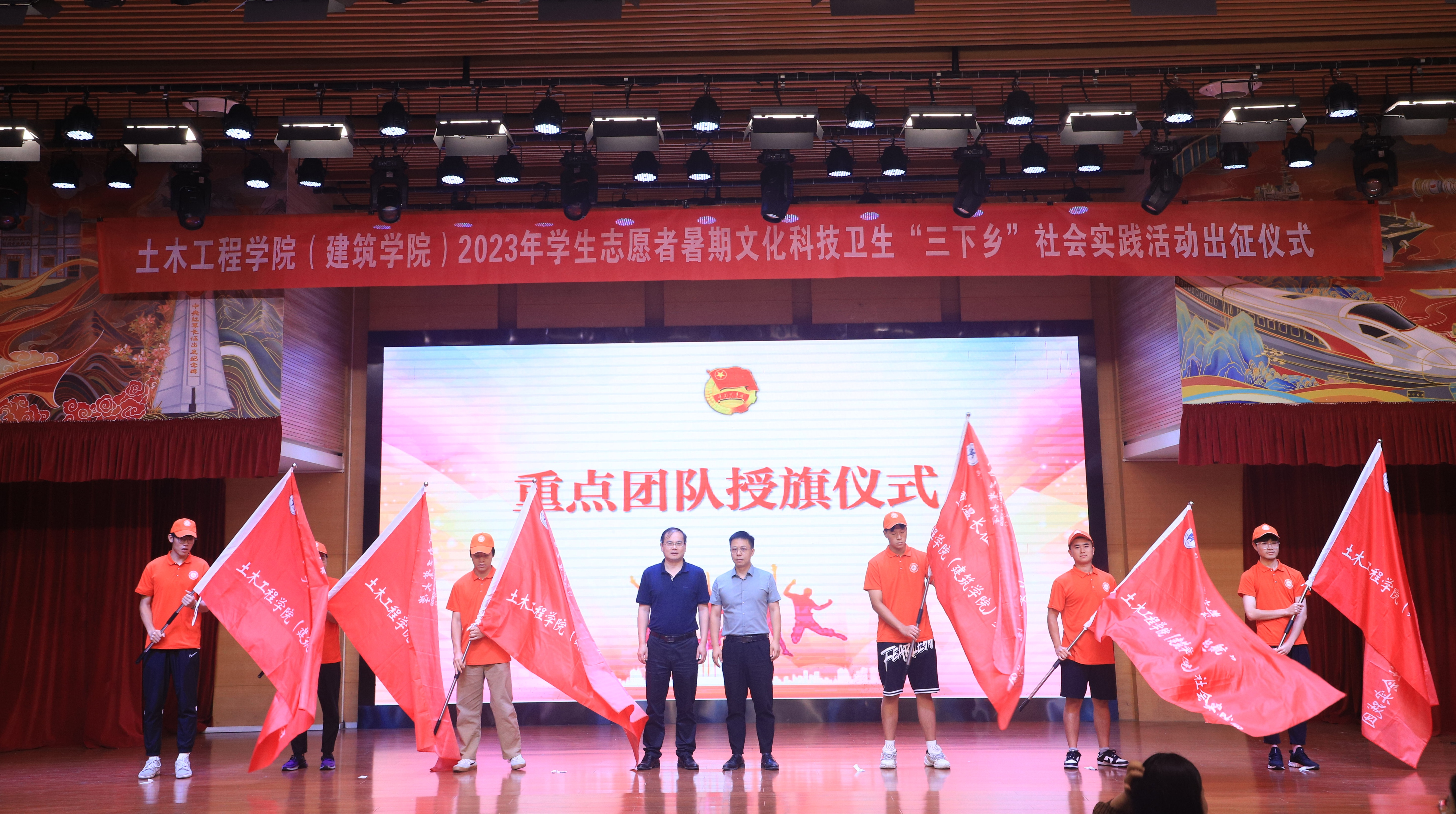 社会实践团队出征,参会的各位领导和老师们为18支重点团队授旗。2021级同学田继航带领所有社会实践团队成员庄严宣誓,表达了青年学子为祖国为人民永久奋斗、在实践中磨砺青春的坚定信念。