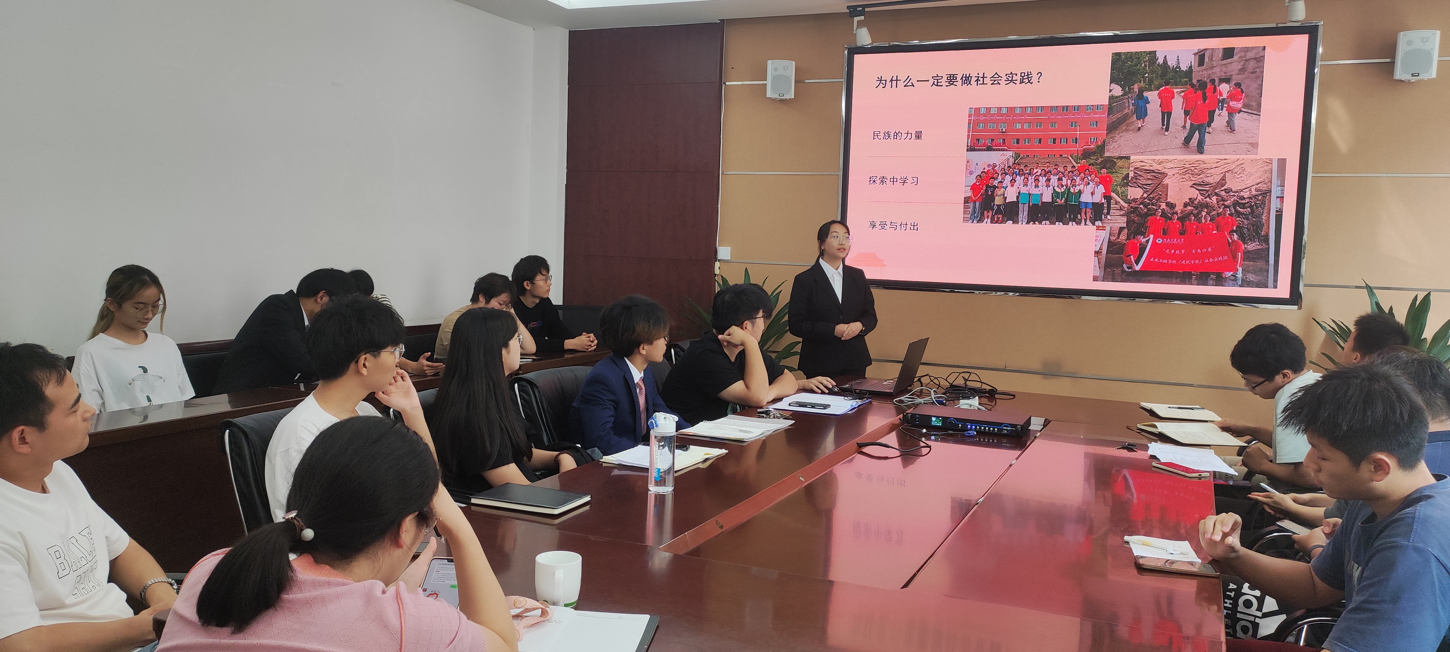 在本次汇报会中,各团队代表围绕实践目的、具体内容、实践意义及实践成果等多个方面进行PPT展示汇报。各团队紧扣实践主题,将理论学习与具体实践相结合,展示内容丰富,实践形式多种多样。他们的活动地点横跨祖国的大江南北,活动形式采用更灵活的线上线下相结合进行开展;活动主题包括民族团结一家亲、重走长征路,宣传肺结核知识,发扬井冈山精神,暖心支教等。各团队在社会大课堂中学习,充分发挥主观能动性,在实践中挑战自我,超越自我,于收官之时收获满满。