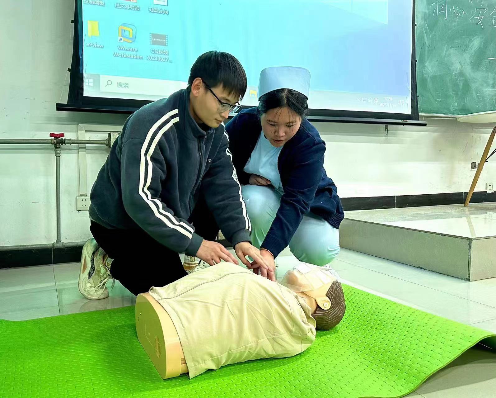 接着刘媛护士使用医学道具亲自演示了“心肺复苏”的急救过程,在医生和护士的指导下,部分同学亲自参与了“心肺复苏”的实践操作,通过模拟演练,加深了对这一技能的理解和掌握。