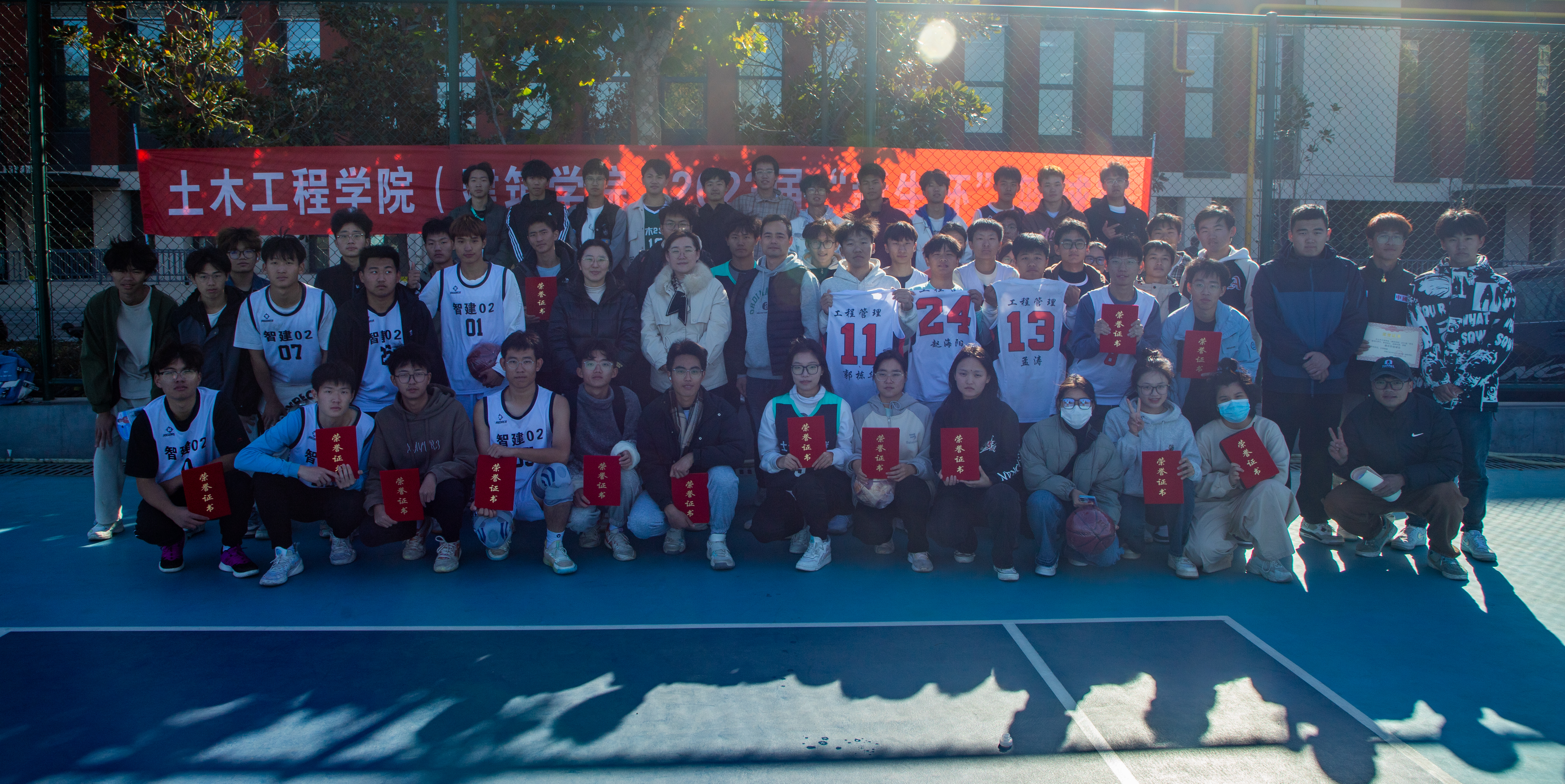 作为学院的传统活动之一,“新生杯”篮球赛不仅为同学们提供了展示活力与青春的舞台,而且通过团队配合增强了班级凝聚力。赛场上,双方队员奋力拼抢,同学们积极投入、全力以赴,火力全开、勇往无前。干净敏捷的运球转身、精准无误的三分投篮,不知疲倦的奔跑、跳跃、防守、进攻,一个个回合将比分迫近、反超、取胜。赛场上的声声呐喊与喝彩,热烈而澎湃。最终,智建2302班以精湛的技艺和出色的配合获得男子组冠军,工管联队凭借出色的团队合作和稳定的表现,成功夺得了女子组的冠军。
