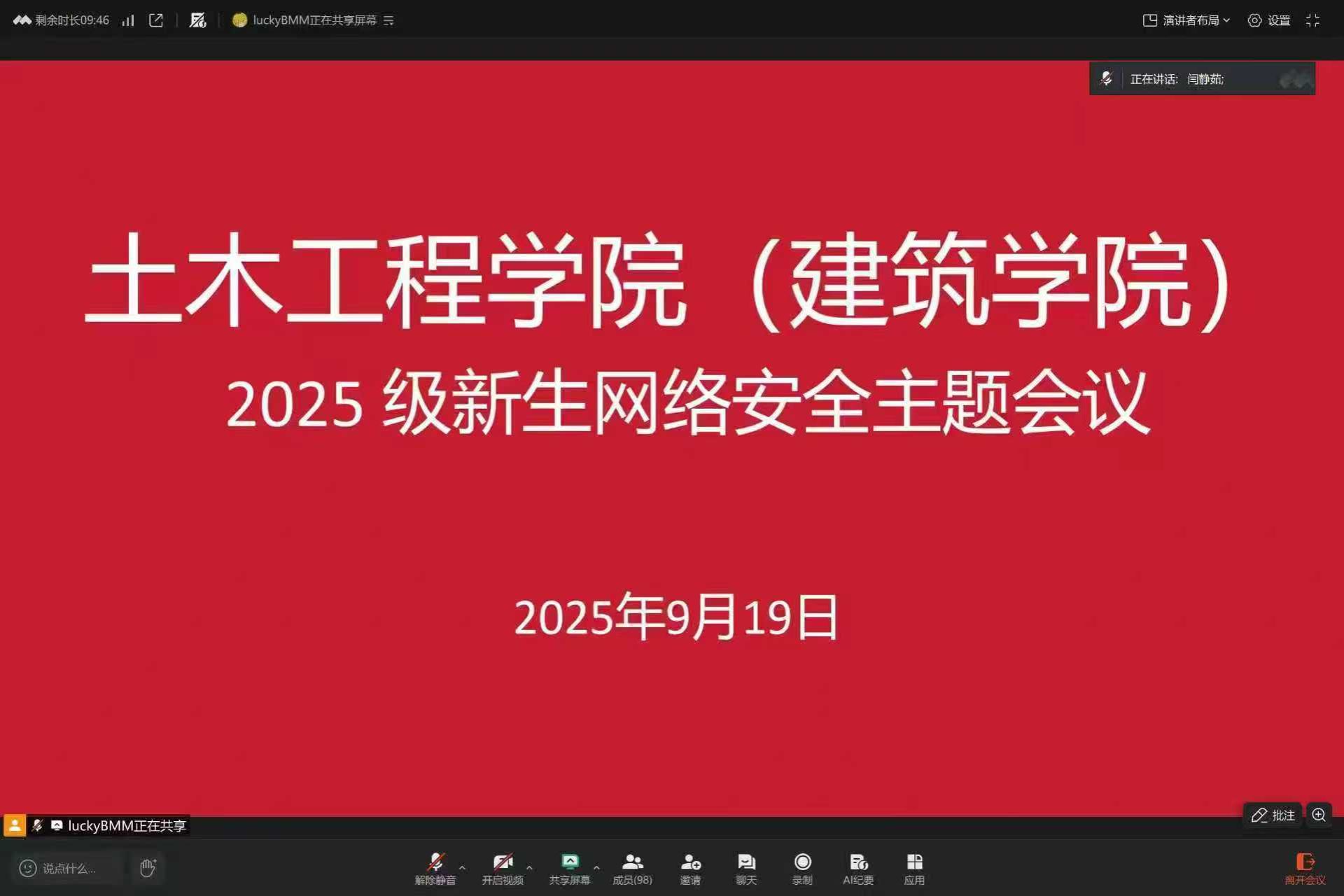 为帮助 2025 级新生快速适应大学生活、树立网络安全意识与集体荣誉感,9 月 19 日,成人漫画 在腾讯会议组织召开 2025 级新生网络安全主题会议暨新生工作会议。学院党委副书记杨阳、团委书记闫静茹、辅导员吴霞以及全体2025级新生参加会议。